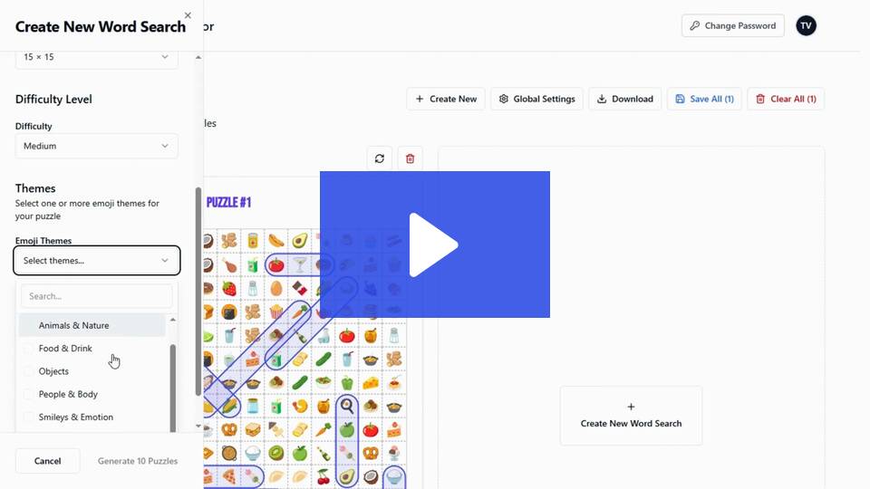 You simply choose a theme (like Animals, Food, or Emotions), select your grid size and difficulty level, and the system generates unique, ready-to-publish puzzles along with their solution pages.