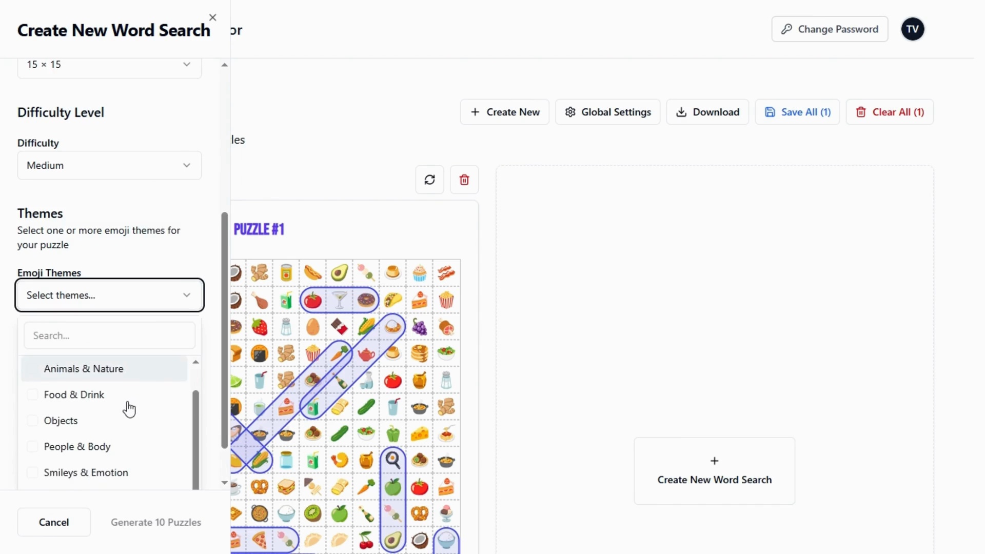 You simply choose a theme (like Animals, Food, or Emotions), select your grid size and difficulty level, and the system generates unique, ready-to-publish puzzles along with their solution pages.