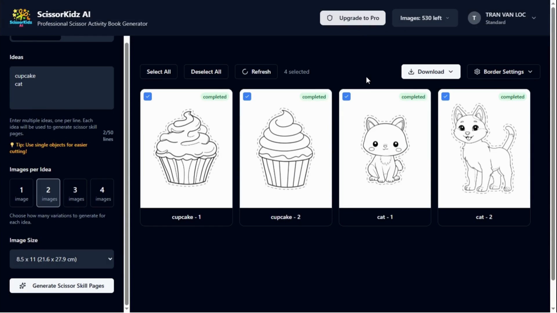 ScissorKidz AI is a cloud-based, AI-powered tool that lets you instantly create unique, ready-to-sell Scissor Skills Books complete with kid-friendly cut-out pages, adjustable cutting line thickness, and padding controls.